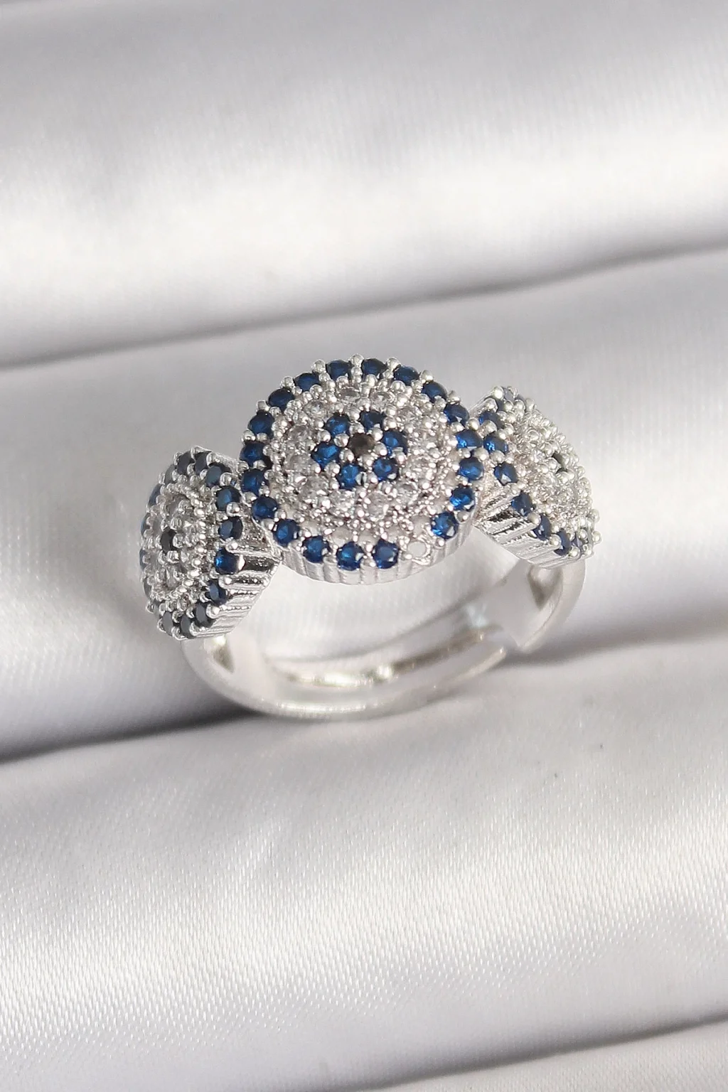 Pirinç Gümüş Renk Zirkon Taşlı Nazar Boncuk Model Ayarlanabilir Kadın Yüzük