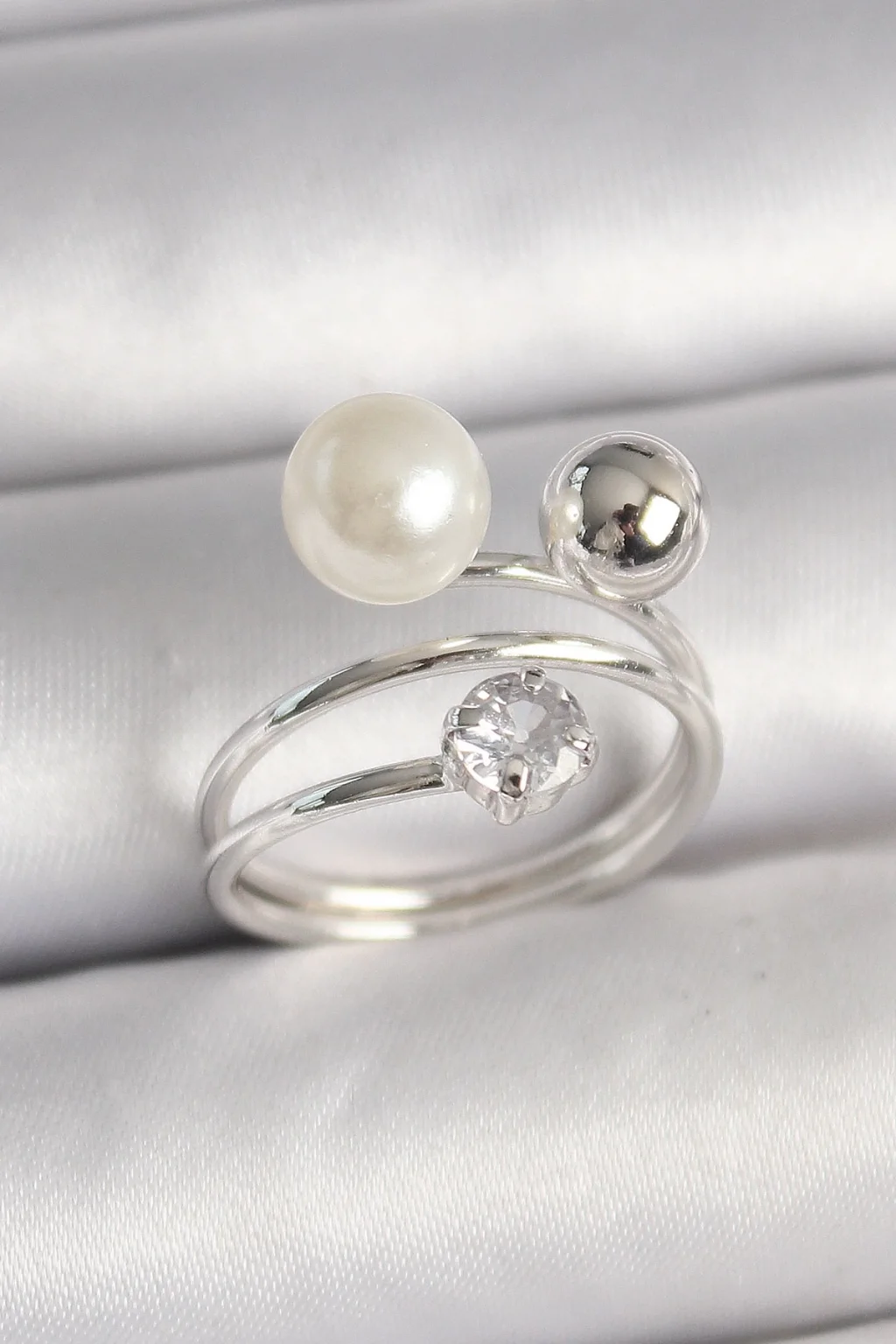 Pirinç Gümüş Renk Zirkon Taşlı Toplu İnci Model Kadın Yüzük