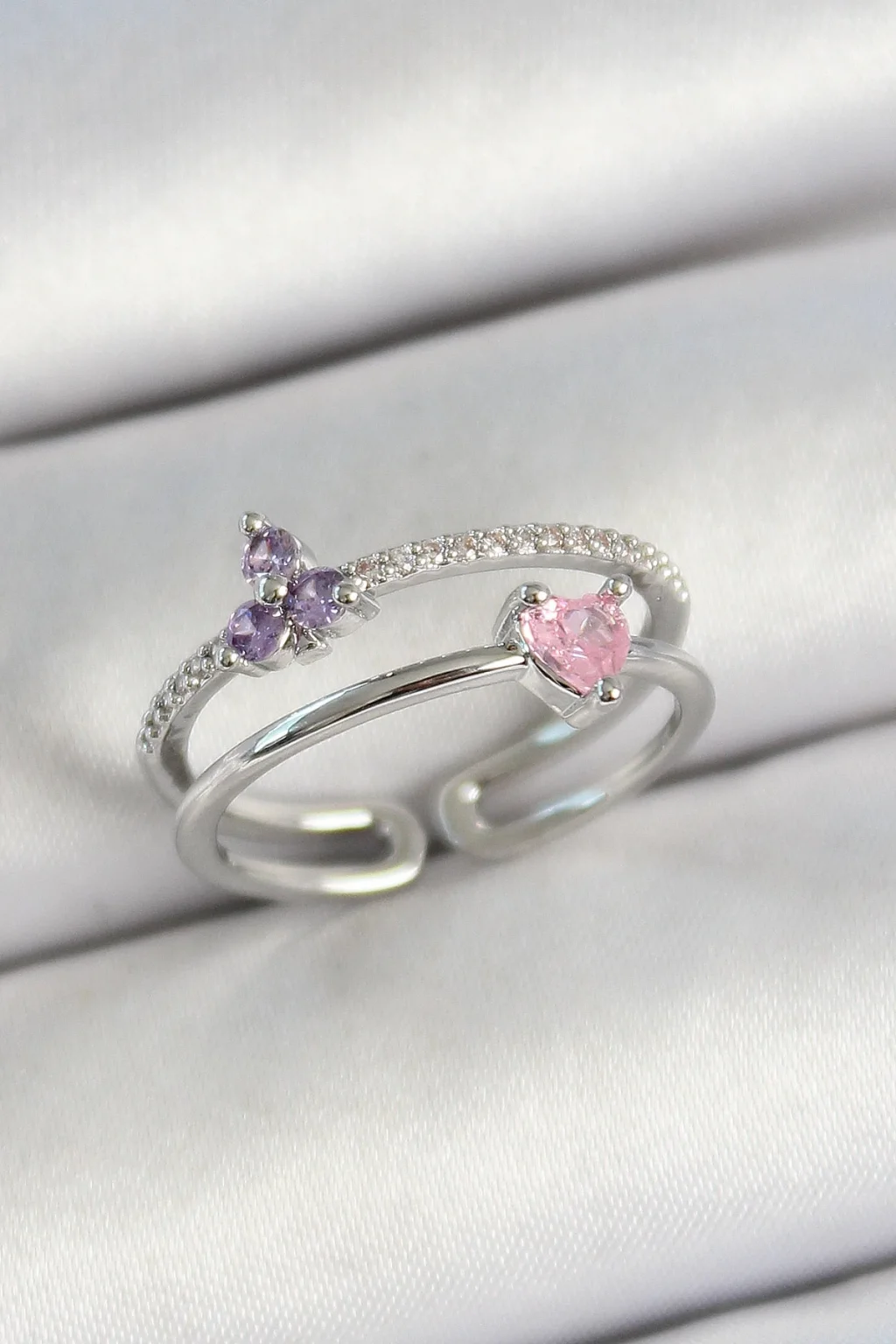 Pirinç Kalp Ve Çiçek Figürlü Zirkon Taşlı Gümüş Renk Ayarlanabilir Kadın Yüzük
