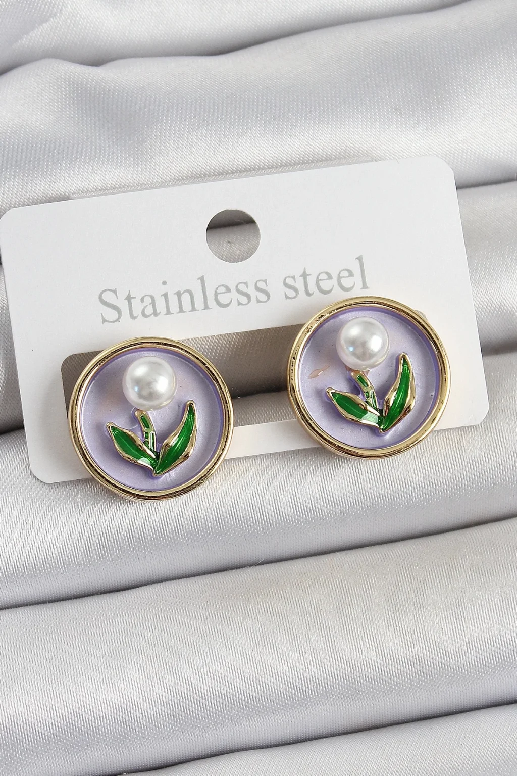 Pirinç Mor Mineli Lale Figürlü Sanatsal Portre Model Gold Renk Kadın Küpe