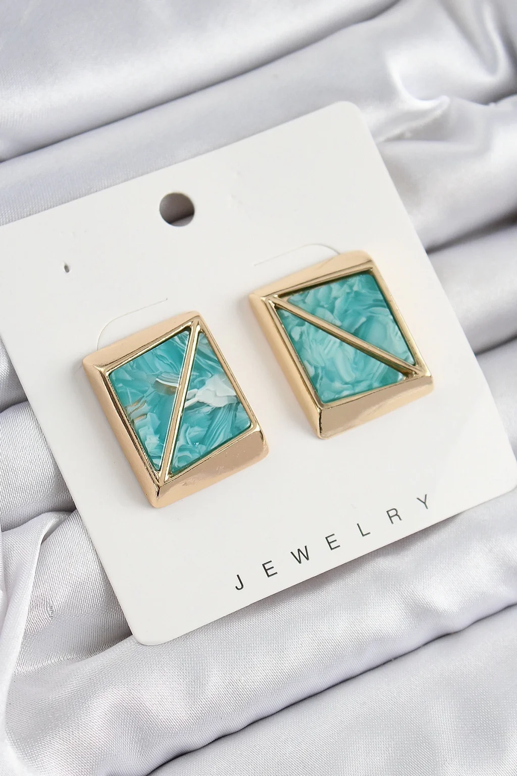 Pirinç Turkuaz Üçgen Kesim Detaylı Kare Model Vintage Gold Renk Kadın Küpe