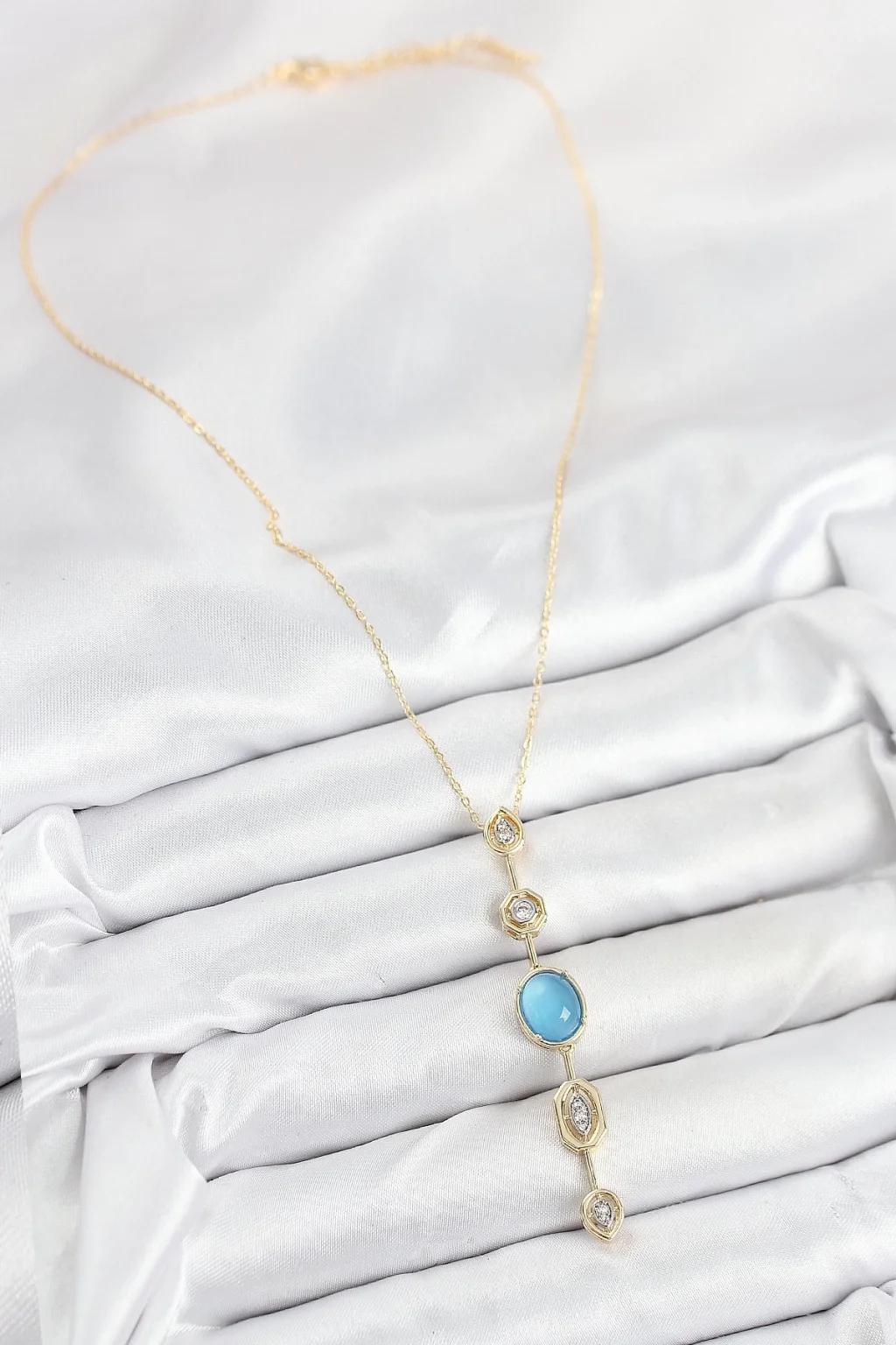 Pirinç Zincir Mavi Gold Renk Zirkon Taşlı Y Kolye