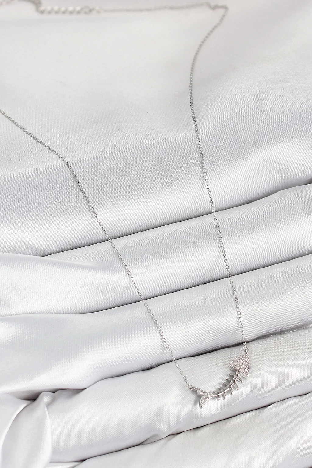 Pirinç Zirkon Taşlı Balık Kılçığı Model Gümüş Renk Kadın Kolye