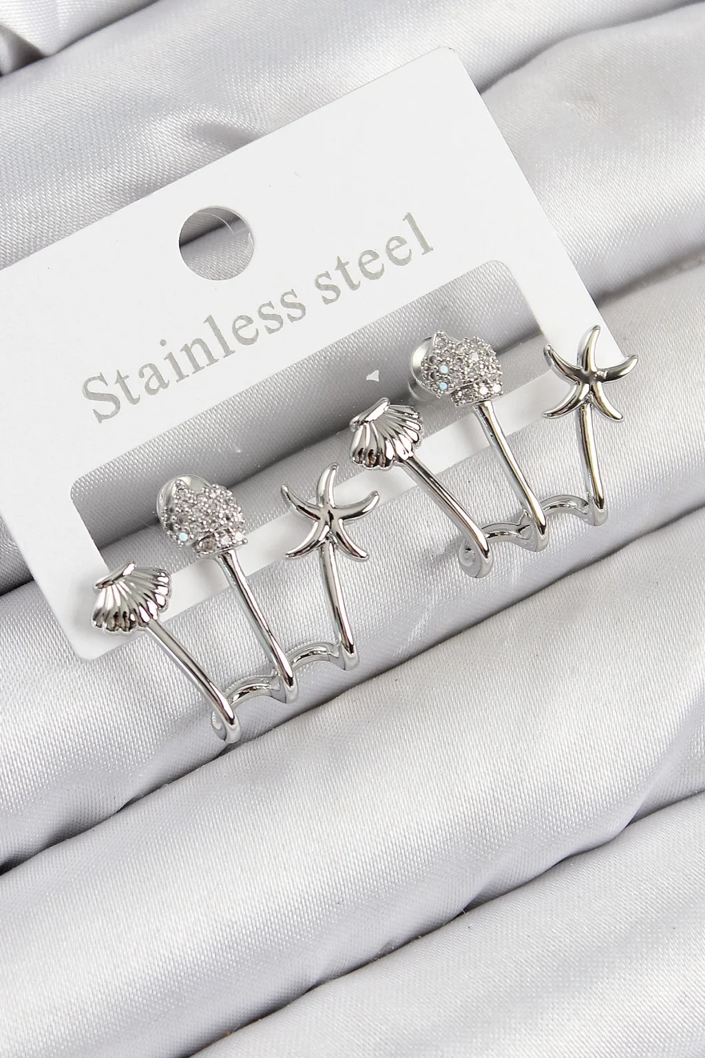 Pirinç Zirkon Taşlı Deniz Yıldızı ve İstiridye Model Gümüş Renk Kadın Küpe