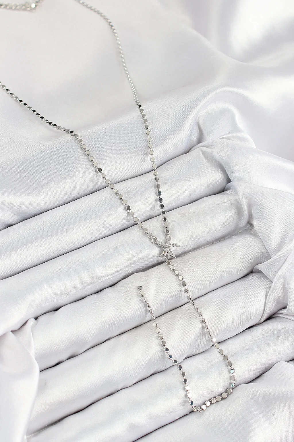Pirinç Zirkon Taşlı Ezme Zincirli Deniz Yıldızı Model Gümüş Renk Y Kolye