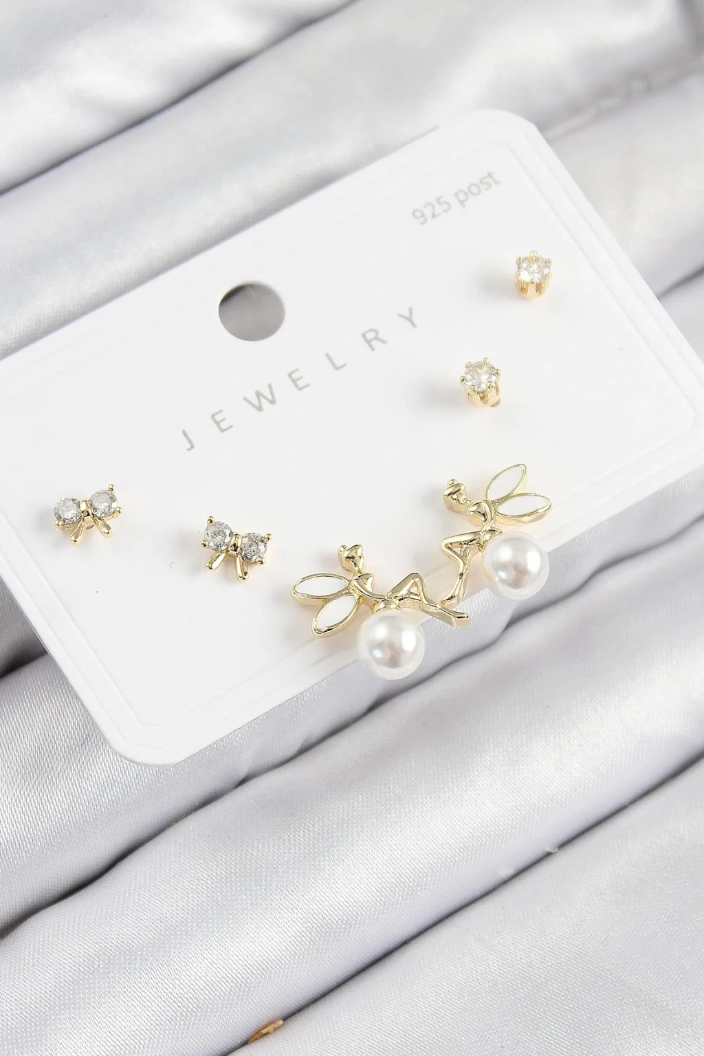 Pirinç Zirkon Taşlı İnci Melek Model Gold Renk 925 Ayar Gümüş Çivi Kadın Küpe Set