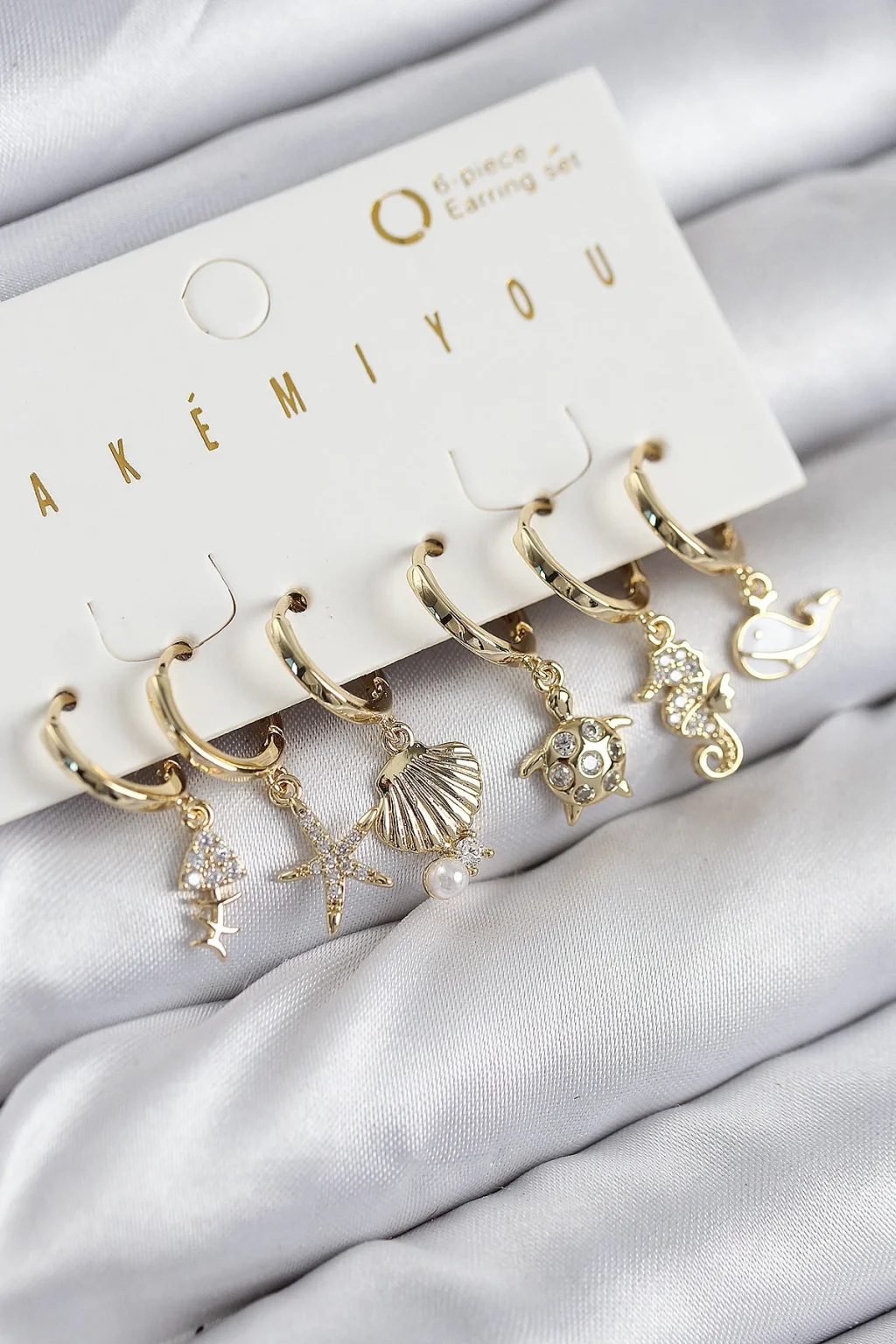 Pirinç Zirkon Taşlı İstiridye Balina Ve Yıldız Gold Renk 6'lı Küpe Set