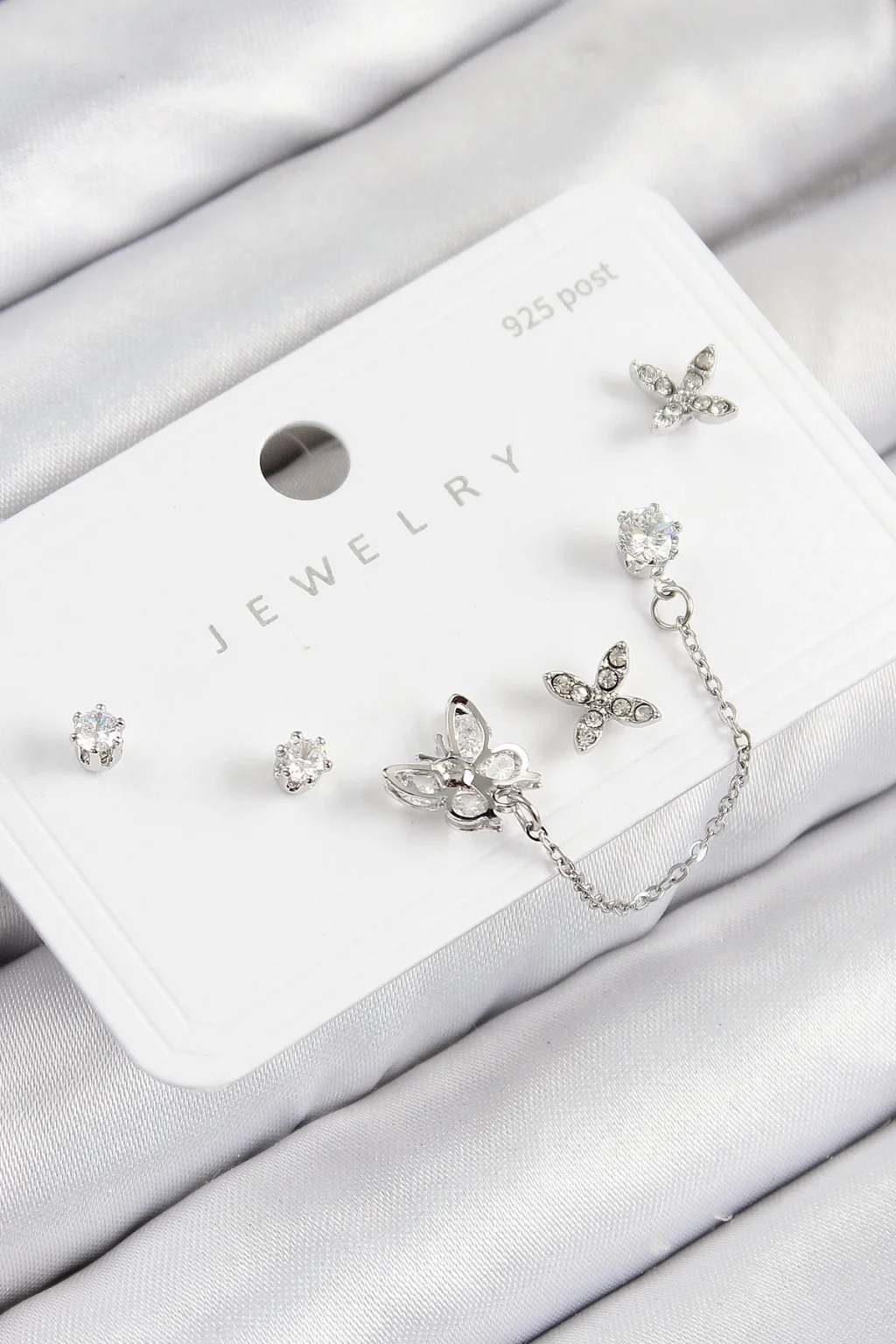 Pirinç Zirkon Taşlı Kelebek Model Gümüş Renk 925 Ayar Gümüş Çivi Kadın Küpe Set