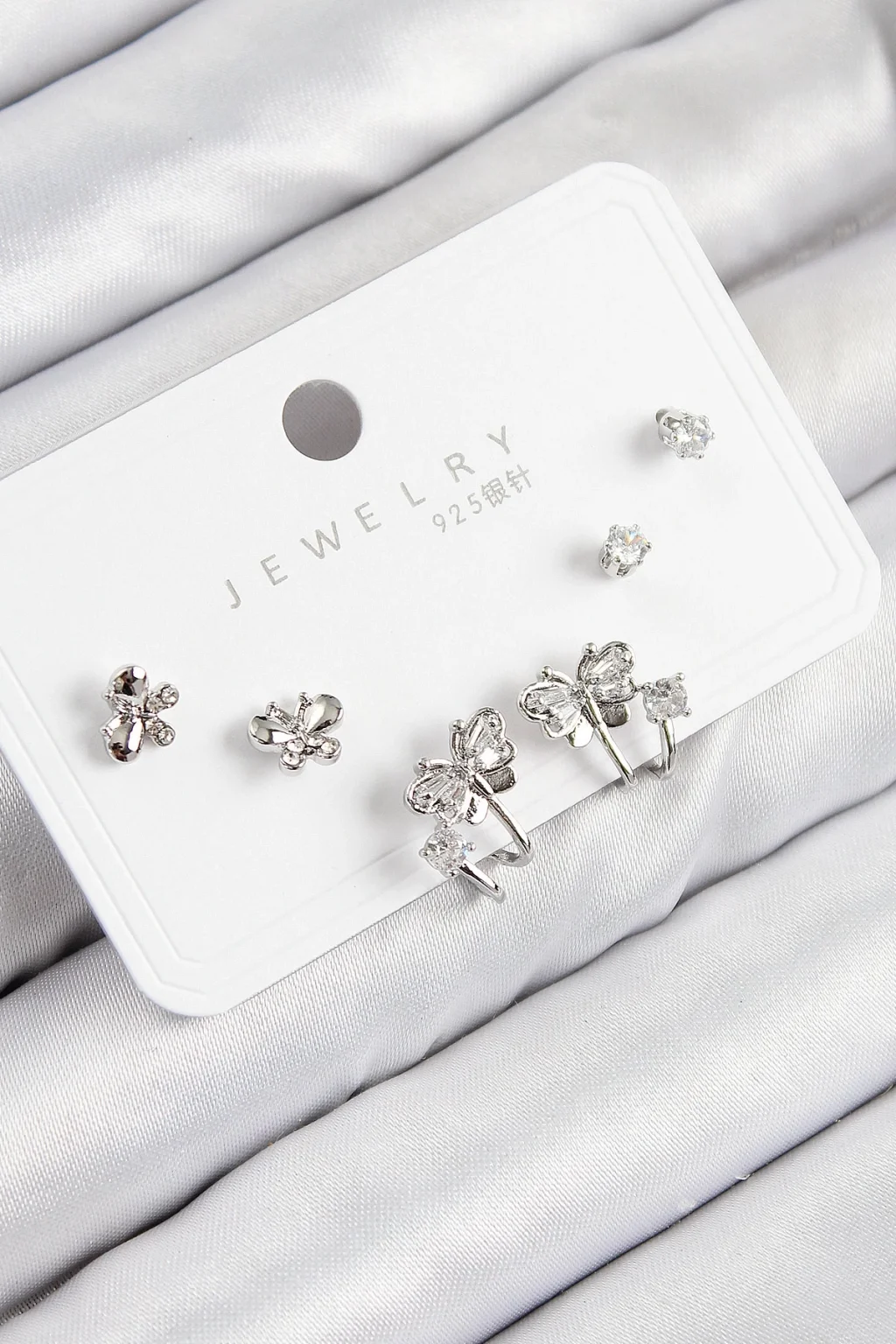 Pirinç Zirkon Taşlı Kelebek Model Gümüş Renk 925 Ayar Gümüş Çivi Kadın Küpe Set