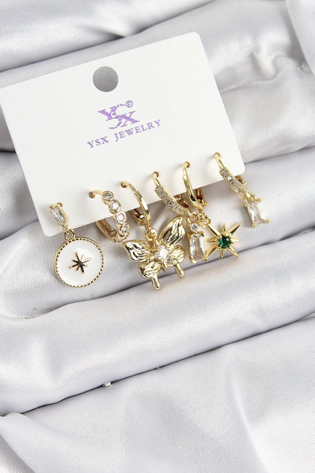 Pirinç Zİrkon Taşlı Kelebek ve Yıldız Model Gold Renk 3'lü Çift Kadın Küpe