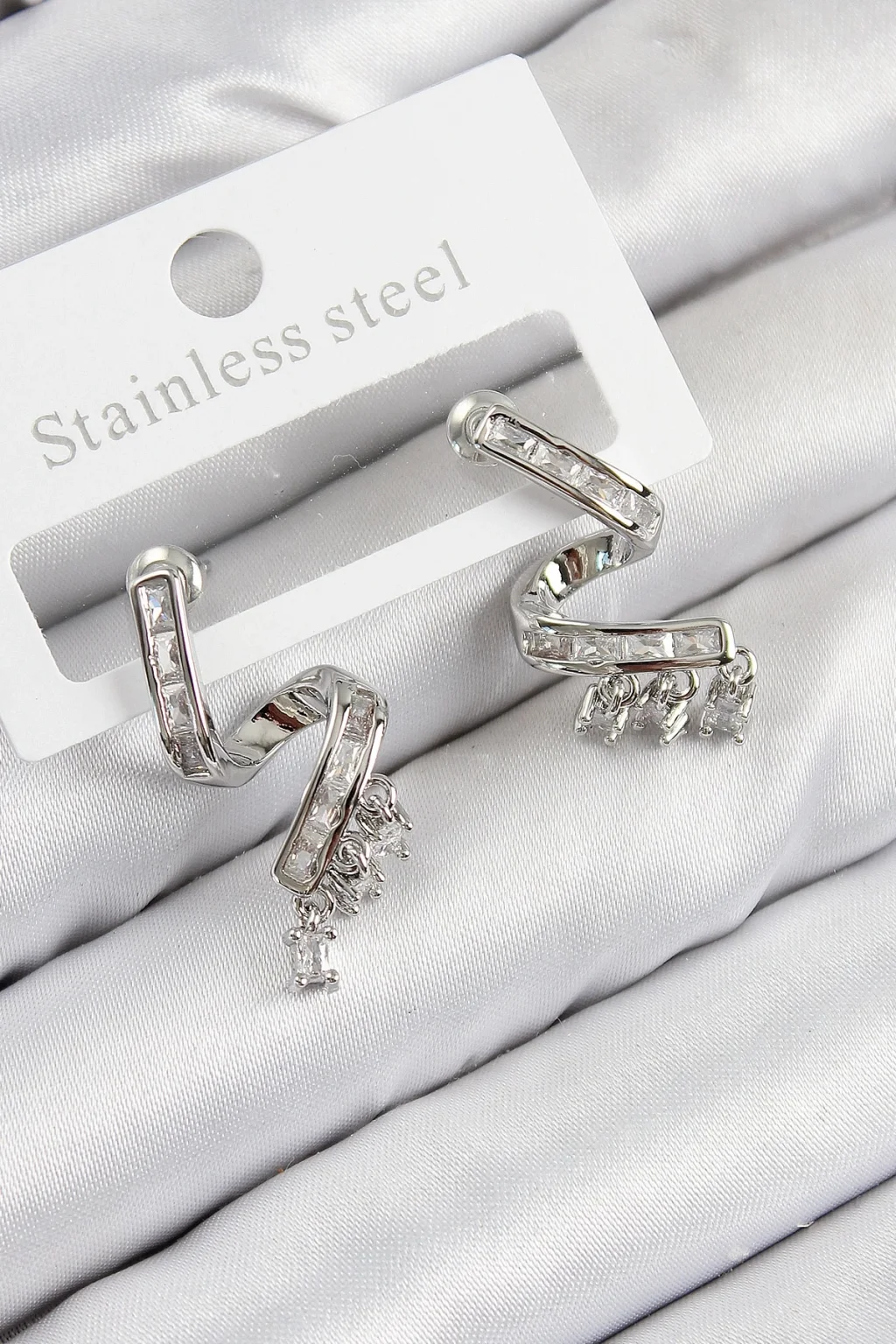 Pirinç Zirkon Taşlı Kıvrımlı Model Gümüş Renk Kadın Küpe