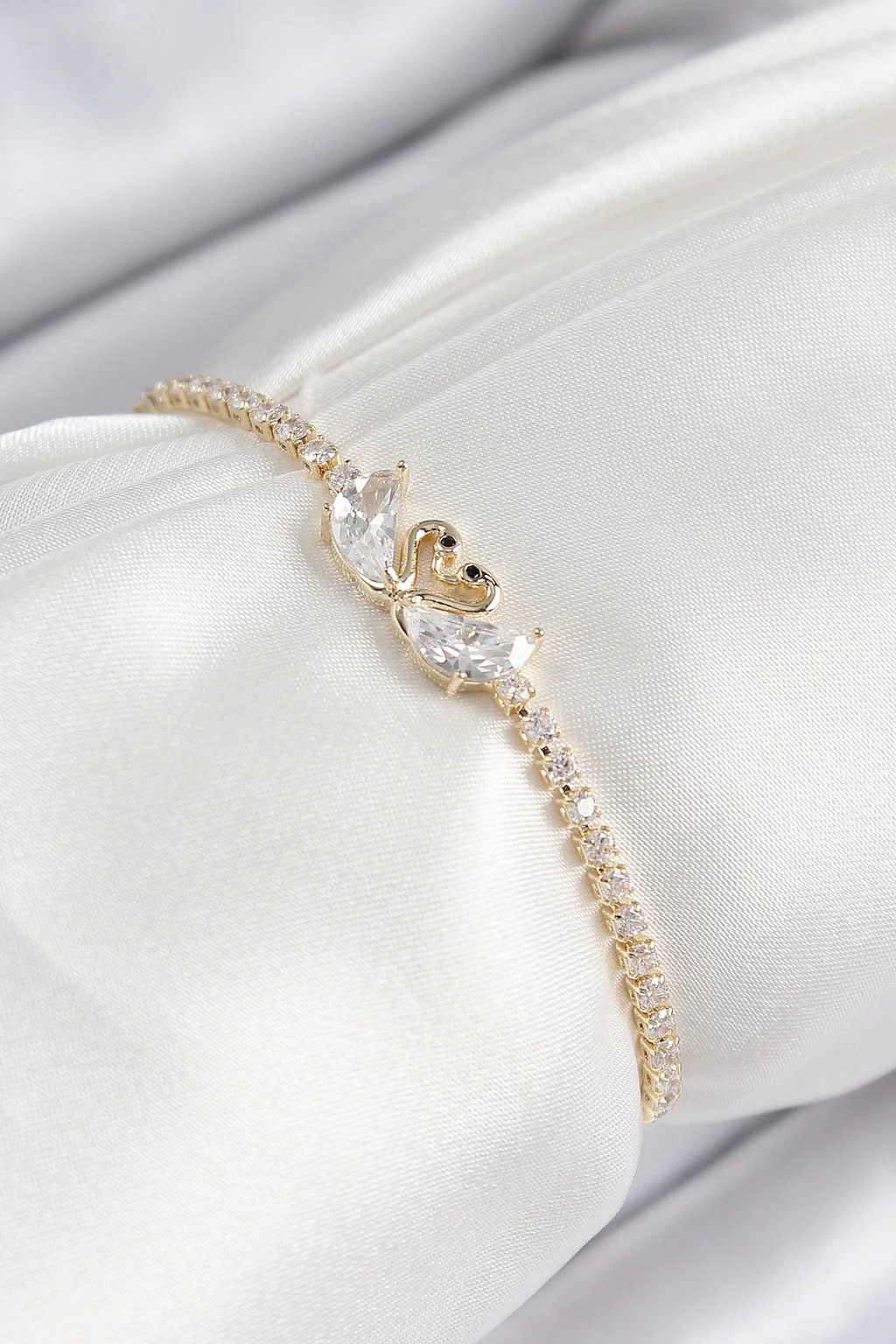 Pirinç Zirkon Taşlı Kuğu Model Gold Renk Asansörlü Kadın Bileklik