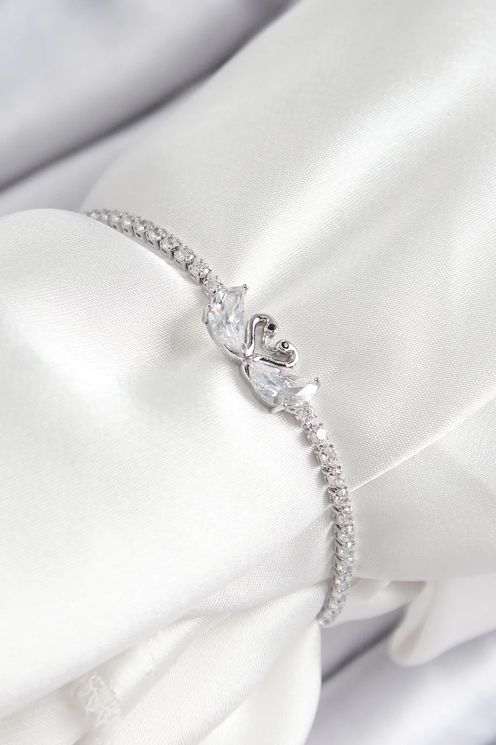 Pirinç Zirkon Taşlı Kuğu Model Gümüş Renk Asansörlü Kadın Bileklik