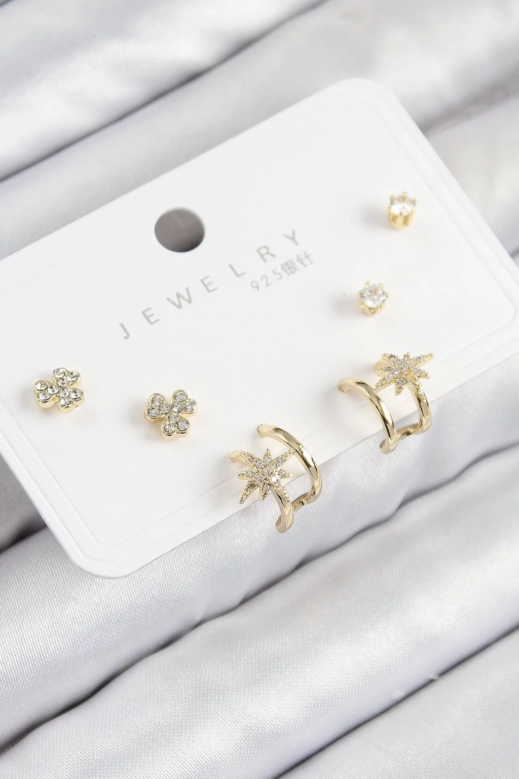 Pirinç Zirkon Taşlı Kutup Yıldızı Model Gold Renk 925 Ayar Gümüş Çivi Kadın Küpe Set