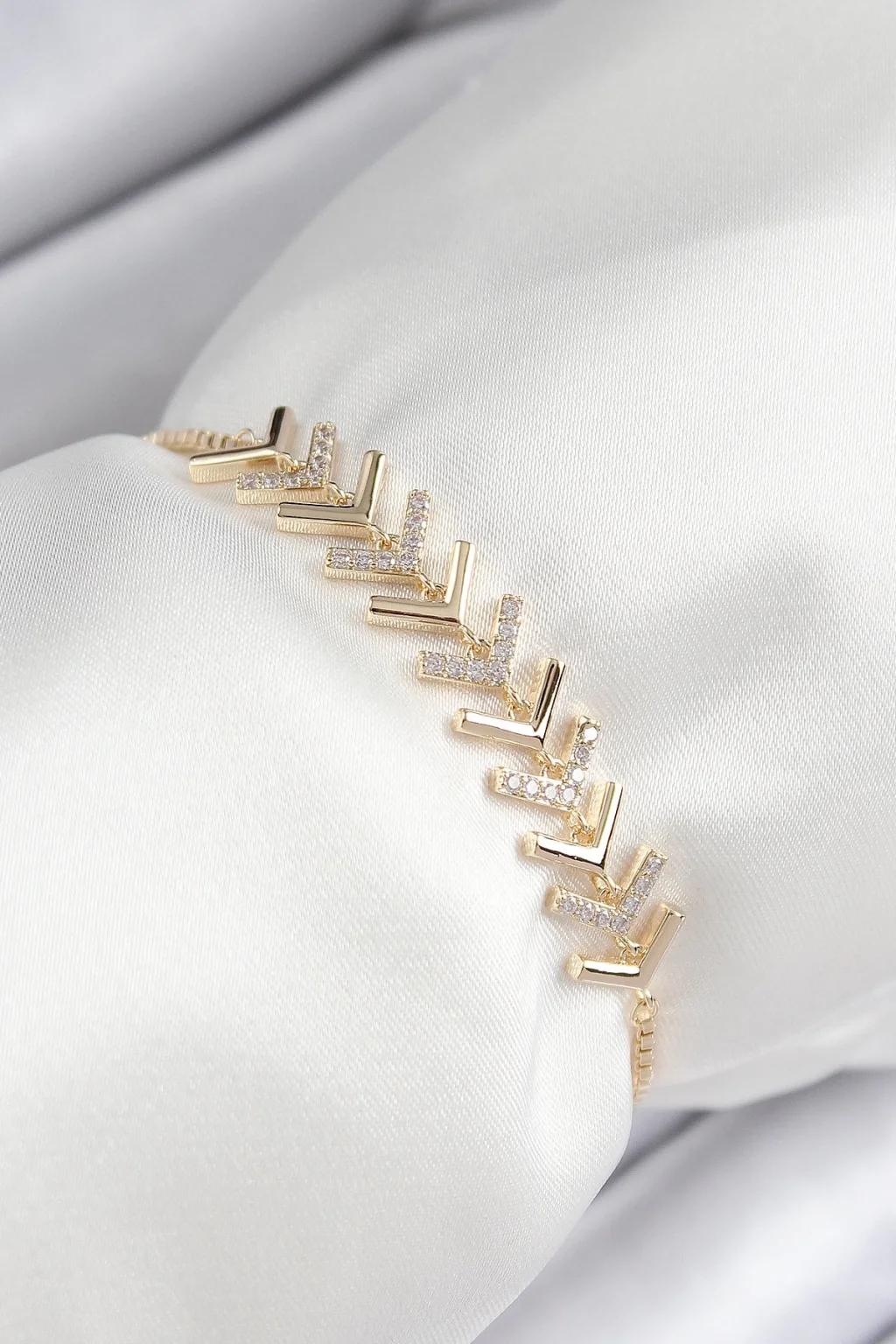 Pirinç Zirkon Taşlı Sıralı Ok Model Gold Renk Asansörlü Kadın Bileklik