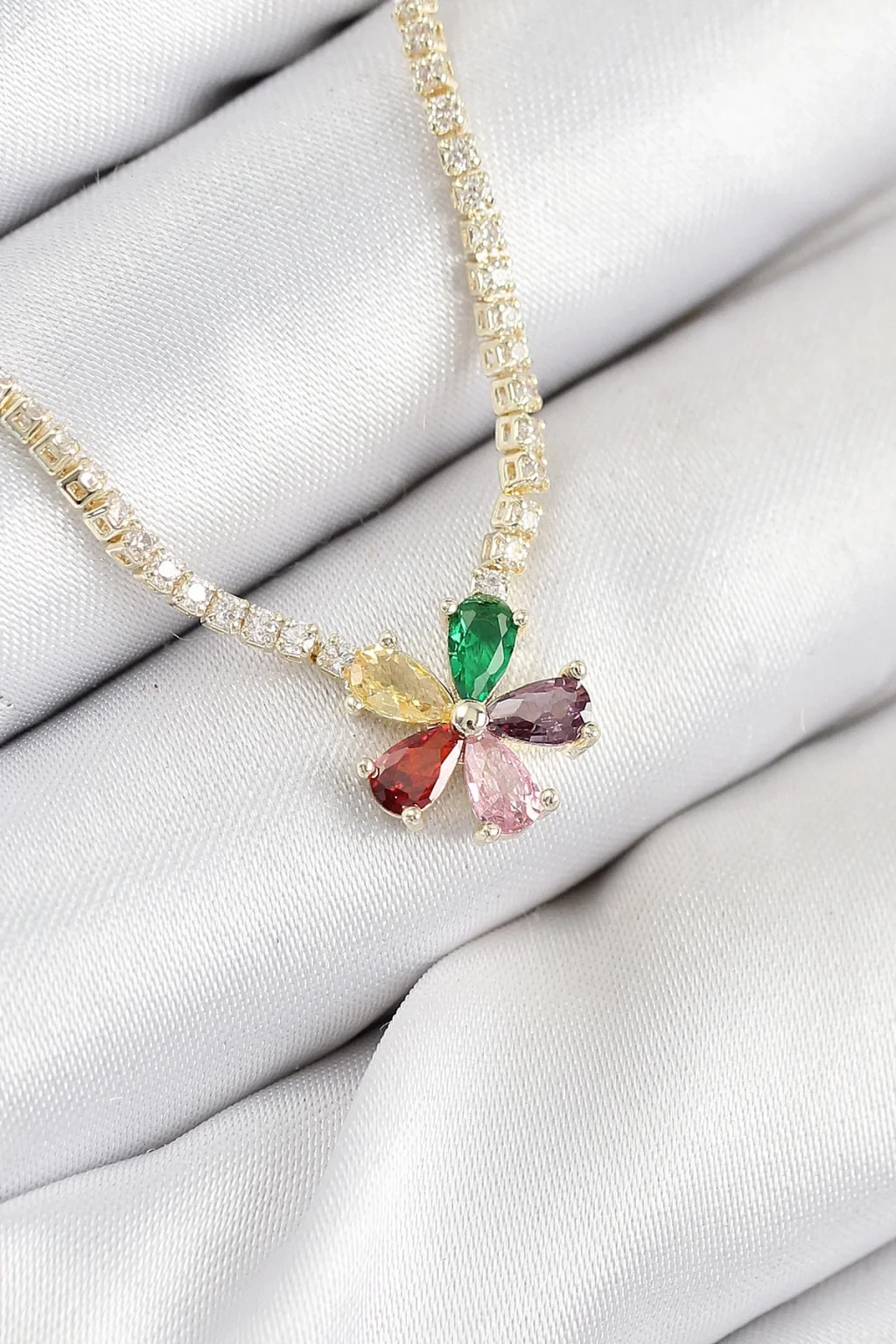 Pirinç Zirkon Taşlı Su Yolu Asorti Çiçek Model Gold Renk Kadın Kolye