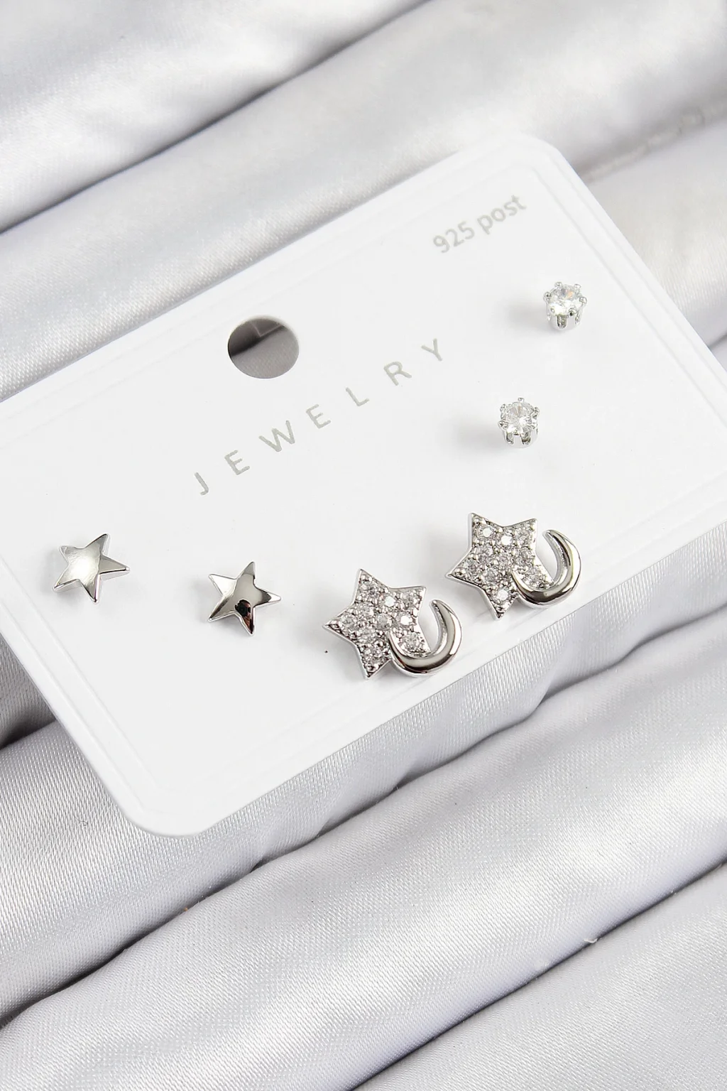 Pirinç Zirkon Taşlı Yıldız Model Gümüş Renk 925 Ayar Gümüş Çivi Kadın Küpe Set