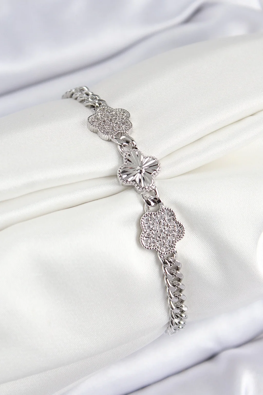 Pirinç Zirkon Taşlı Yonca Model Gümüş Renk Kadın Bileklik