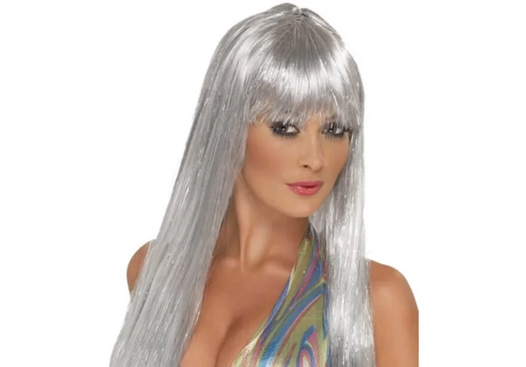 Platin Gri Gümüş Renk Uzun Parti Peruğu Uzun Takma Peruk