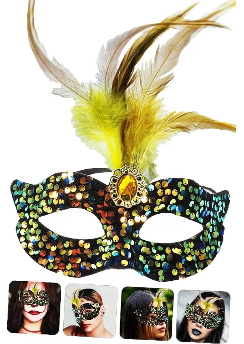 Siyah Kadife Üzeri Rengarenk Payetli Pullu Sarı Tüylü Sarı Taşlı Parti Maskesi 19x21 Cm