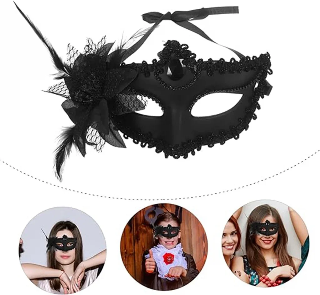Siyah Mat Renk Yandan Tüylü Güllü Parti Balo Venedik Maskesi 16x22