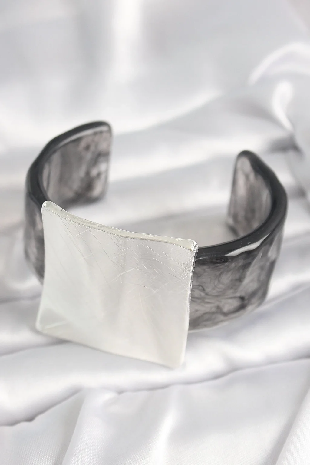 Siyah Mermer Desen Akrilik Plastik Gümüş Kare Plaka Model Vintage Kadın Bilezik