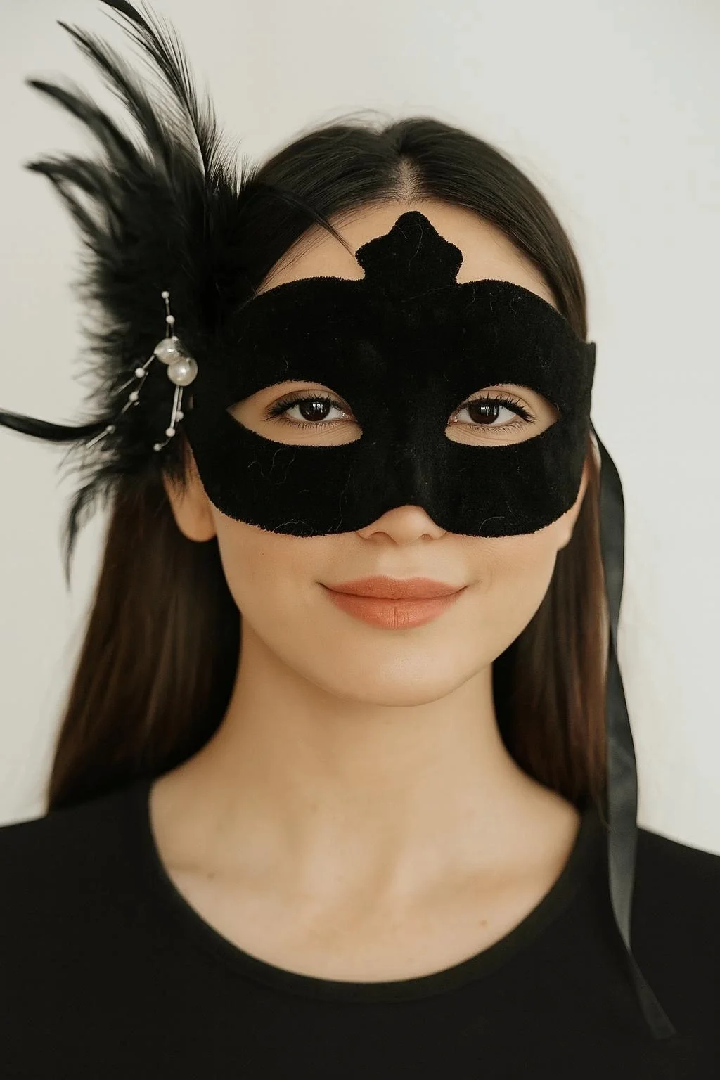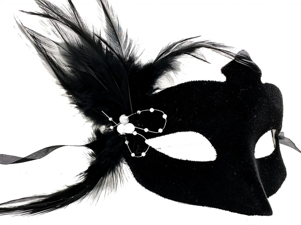 Siyah Renk Yandan Tüylü Süet Kaplama Beyaz İncili Parti Maskesi 18x15 Cm